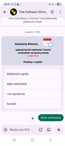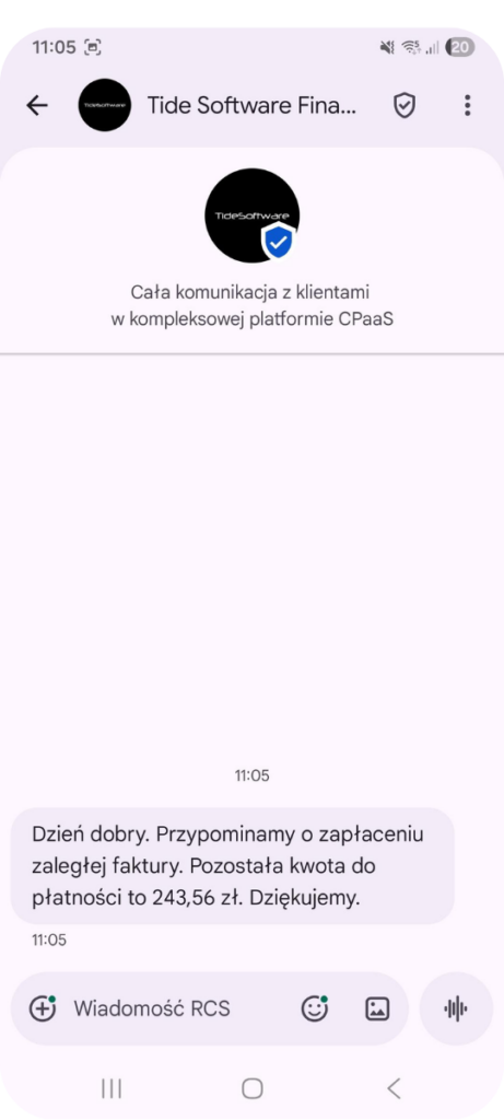 RCS jest kanałem komunikacji zgodnym z wymogami bezpieczeństwa. Wdrożenie wysyłek RCS z platformy CPaaS Tide Software lub po API pozwala firmom prowadzić komunikację skuteczną, bezpieczną i dopasowaną do oczekiwań współczesnych dłużników.
